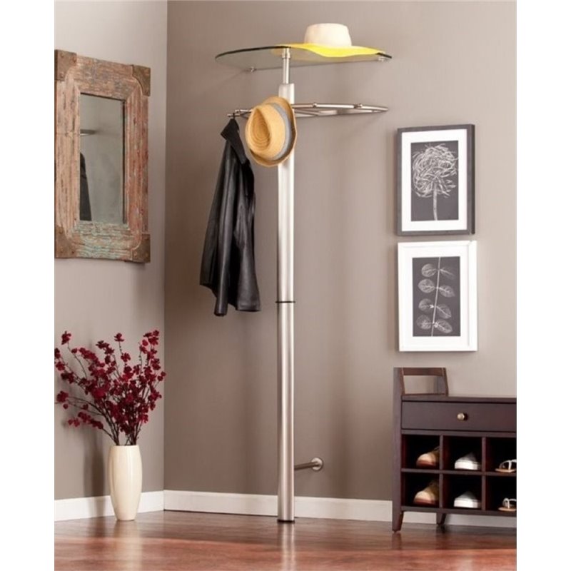 ![]() Bowery Hill - Coat Racks - BH656676 - From the floor up, this pretty, practical wall mount has you covered. Five hooks hang coats, leashes, and even a handbag or two. The open, floating glass shelf is wide and high enough to keep Sparky from knocking your coffee to the floor as you race out the door, and the clean, contemporary style will have everyone asking what artist sculpted the piece.Finish: Silver with GlassMaterial: Metal Tube, 10mm Tempered GlassContemporary StyleIncludes screw holes and glass clamps for wall mountingVersatile, simplistic anywhere storageTempered floating glass shelf and 5 hooksSatin nickel finishAssembly RequiredSpecifications:Overall Product Dimension: 73.25"" H x 27.75"" W x 16.5"" DProduct Weight: 31 lbsSupports up to: 10 lbs (shelf), 5 lbs (per hook) Price: 173.30 |