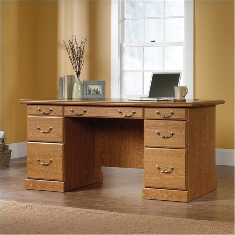 ![]() Bowery Hill - Executive Desks - BH238776 - collection executive desk is constructed of dense engineered wood with a durable laminate finish in Carolina Oak. Traditional American country style provides endless versatility with finely detailed moldings, raised panel doors, and brassfinish hardware. Executive desk features a flipdown moulding reveals a slideout keyboard/mouse shelf with metal runners and safety stops. Desk has three utility drawers and two letter/legal file drawers. To care for your furniture, simply clean with your favorite furniture polish or a damp cloth, then wipe dry. Ships ready to assemble. Large drawer/shelf with metal runners and safety stops features flip-down panel for keyboard/mouse in this model of our executive desks collection ; Constructed of laminated engineered wood ; Two file drawers with full extension slides hold letter, legal or European size hanging files ; Three small drawers feature metal runners with safety stops ; Desk top has grommet holes for electrical cord access ; Quick and easy assembly with patented T-lock drawer system ; Carolina Oak finish . Price: 915.59 |