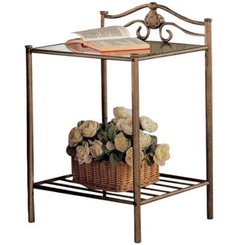 ![]() Bowery Hill - Nightstands - BH459001 - Transitional style Curved swirled crown detail and floral accentSleek glass table topSlatted metal lower shelf Antique brushed bold finishElegant curves, round legsSpecifications:Overall Product Dimensions: 32” H x 20” W x 20” D Price: 87.99 |